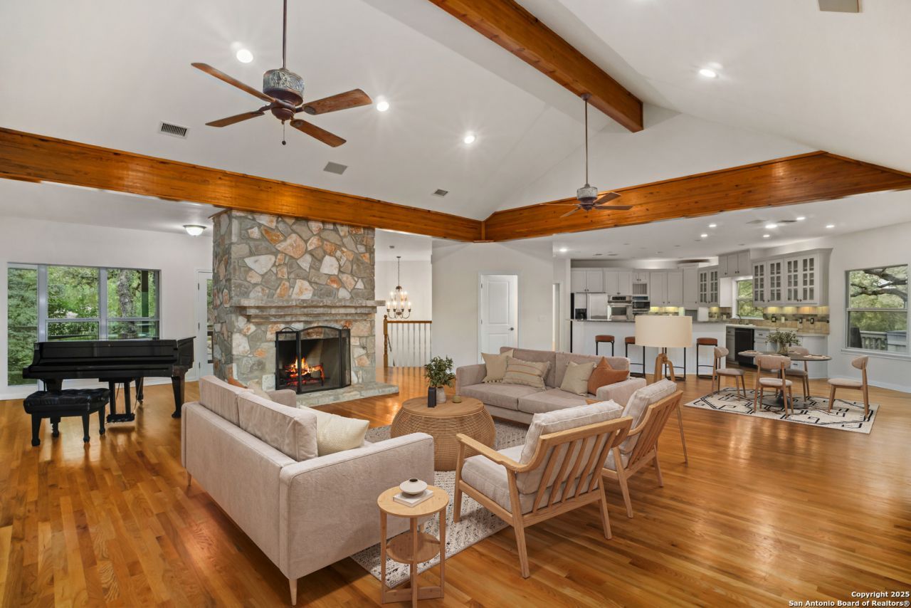 Set along 200 feet of direct Guadalupe River frontage, 1245 Phantom Rider Trail offers a rare opportunity to own two separate residences on one private Hill Country acre in Spring Branch. The main home spans 4,706 square feet and was designed for gathering. Multiple levels open to expansive decks and patios that feel suspended among the trees. The layout includes five bedrooms, three and a half baths, an entertainers lower level with game space, catering kitchen, and a convenient dumbwaiter connecting both floors. A pool, hot tub, fire pit, and three car garage complete the experience. Closer to the river sits a second residence built in 2018, offering 1,314 square feet with three bedrooms and two baths, plus an additional pool bath below. Constructed on steel pylons driven approximately 16 feet into the ground, the home opens through French doors to a shaded patio overlooking the water. The gently sloping yard makes access to the river easy, and the covered space below is ideal for storing kayaks and gathering after a day on the water. An elevation certificate is available, and the current owner has not been required to carry flood insurance. Whether envisioned as a full time residence, a multi generational retreat, or a private river escape with room for guests, this property delivers flexibility, privacy, and true Hill Country river living.