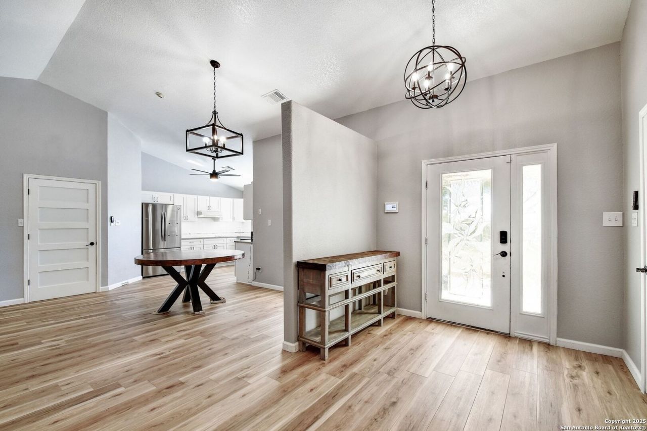 Spacious 2,332 sq ft, 4 Bedroom 2 Bath home on a beautiful large lot. Fenced and gated with a large, attached garage two driveways and covered back porch. Great location with easy commute into SA or Austin. Community Pool, Boat Ramp to Canyon Lake, Community Fishing Lake and great neighborhood park. Front porch with large shade trees in front yard. Extra storeroom space in garage, sprinkler system, walk in closets and alarm system with cameras. Recently updated the entire house. New roof 2022, New A/C 2022, remodeled kitchen and baths in 2024. 4th Bedroom addition added and completed 2025. Higher than average square footage for this neighborhood and the 4th bedroom makes it great for a larger family.