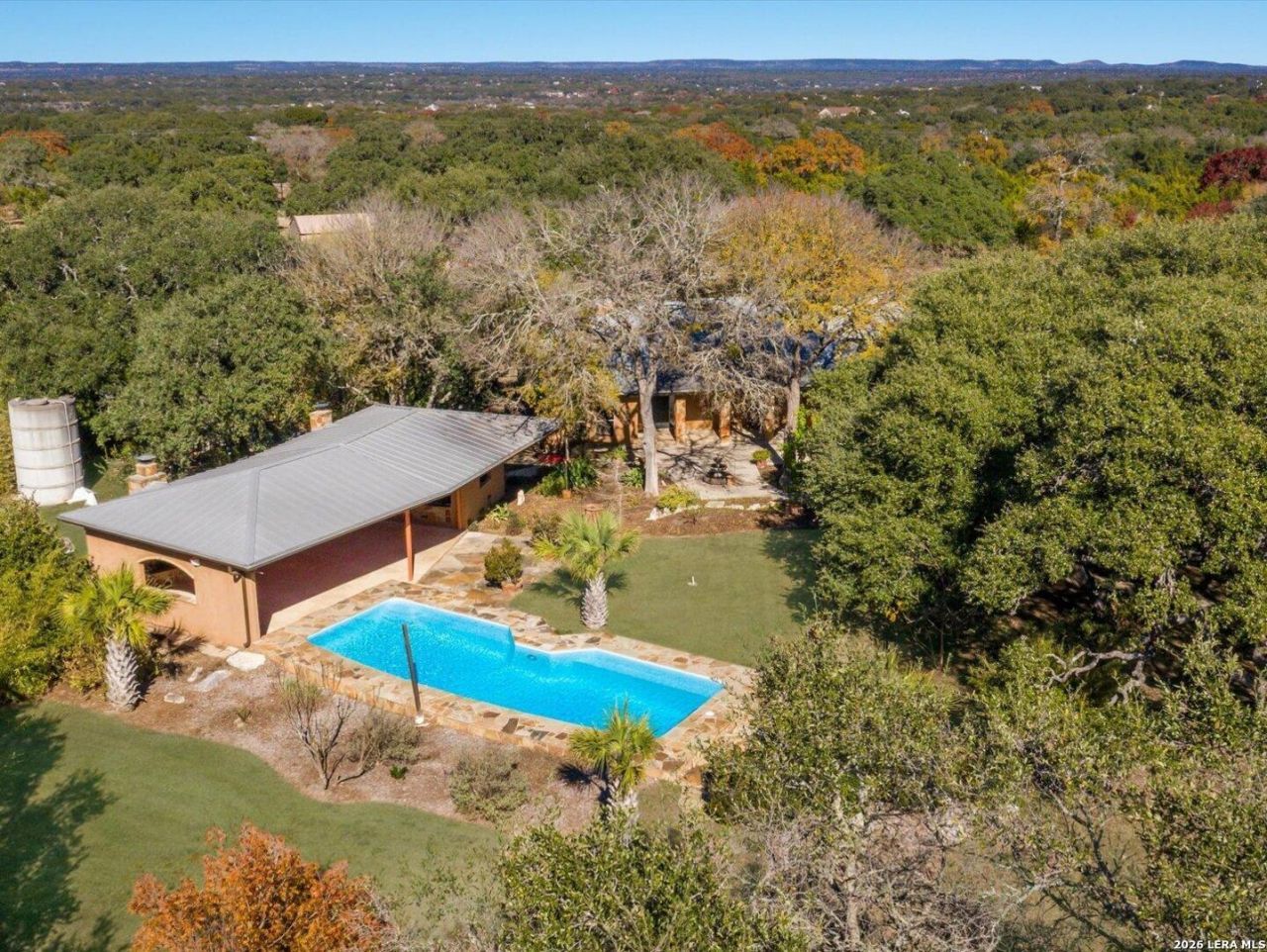 Discover your private oasis on 5 sprawling acres in the prestigious River Mountain Ranch community. This custom-built home seamlessly blends luxury living with outdoor adventure, creating the perfect retreat for those who appreciate quality craftsmanship and natural beauty. Inside, soaring vaulted ceilings with exposed wood beams create an impressive sense of space, while stained and scored concrete floors provide both durability and style. The heart of the home features a huge center island with a gas cooktop, complemented by Kenmore Elite appliances including dual ovens. A striking stone fireplace anchors the living area, offering both electric convenience and wood-burning capability for cozy evenings. The 3 bedrooms include a well-appointed primary bedroom, with 2 full bathrooms serving the home. Thoughtful details like ceiling fans with remote controls and a standing seam metal roof demonstrate the quality construction throughout. Your outdoor paradise awaits with an impressive fiberglass pool measuring approximately 16 x 40 featuring depths from 3 to 7 feet and surrounded by beautiful Oklahoma stone decking. The 1100 sf Pool Cabana & Outdoor Kitchen rivals any indoor setup with granite countertops, built-in barbecue grill, dual-burner cooktop, outdoor fireplace, and even a wood-fired pizza oven. Garden enthusiasts will appreciate the 24 x 60 greenhouse with propane heating and circulation systems, complemented by a comprehensive rain catchment system featuring multiple storage tanks strategically placed throughout the property. The water storage infrastructure includes 3 -2,500-gallon tanks in the front yard, 1 -2,500-gallon tank by the garage, and 2 -1,500-gallon tanks by the Greenhouse. Additionally, a spacious 25 x 30 Covered Concrete Space provides excellent storage for recreational vehicles, tools, and lawn equipment. An 8 ft perimeter fence enhances the privacy and security of the entire 5 acre property, while an electric gate provides both convenient access and an additional layer of security for this luxury estate, creating a truly secluded environment for your outdoor amenities and activities. Mature landscaping includes Live Oaks, Monterey Oaks, and diverse native plantings that enhance the propertys natural charm. Located near the Guadalupe River with river access for tubing and kayaking, this exceptional property offers both privacy and convenience to Boerne amenities.