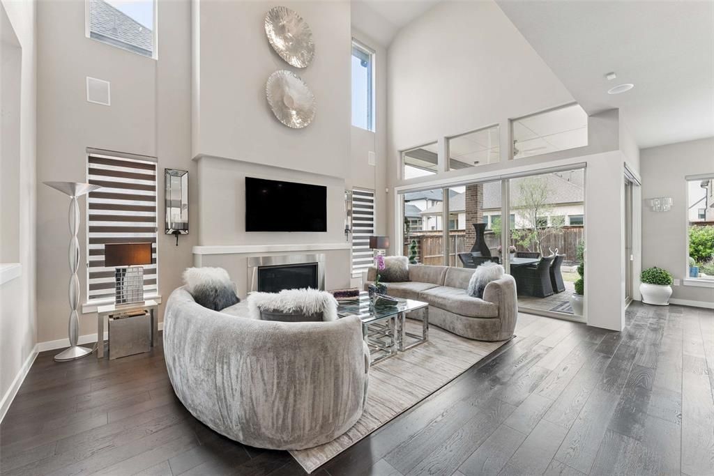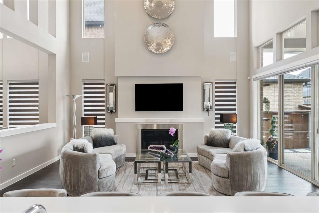 Positioned within the highly sought-after Light Farms community and zoned to acclaimed Prosper ISD, 1401 Ellicott Drive presents a refined, modern residence defined by clean architectural lines, natural light, and a seamless contemporary aesthetic. The home immediately impresses with a vaulted entry and an open layout designed for the way buyers live today. The main living area is both expansive and inviting, featuring two-story ceilings, a gas log fireplace, and sliding glass doors that create a natural extension to the outdoor living space. The kitchen is both sculptural and highly functional, appointed with quartz surfaces and a suite of Electrolux appliances, including a six-burner gas cooktop, stainless vent hood, and extended butler’s pantry that enhances both storage and presentation. The adjoining breakfast area is surrounded by light and opens effortlessly to the outdoor living space. The primary suite offers a true retreat, complete with dual vanities with vessel sinks, quartz surfaces, a freestanding soaking tub, and an oversized walk-in shower with frameless glass and dual showerheads. Separate walk-in closets enhance both comfort and convenience. A secondary bedroom with a full bath on the main level provides flexibility for guests or multigenerational living. Upstairs is designed for both entertainment and everyday living, featuring a dedicated media room wired for surround sound and projector, a spacious game room with wet bar and beverage refrigerator, and two additional ensuite bedrooms, each with walk-in closets and a powder bathroom. The extended covered patio with brick flooring overlooks a beautifully landscaped backyard blending hardscape and green space, creating a private outdoor setting. Residents of Light Farms enjoy access to resort-style amenities including multiple pools, a fitness center, clubhouse, tennis and volleyball courts, parks, trails, and an on-site elementary school—offering a lifestyle that is both elevated and connected.