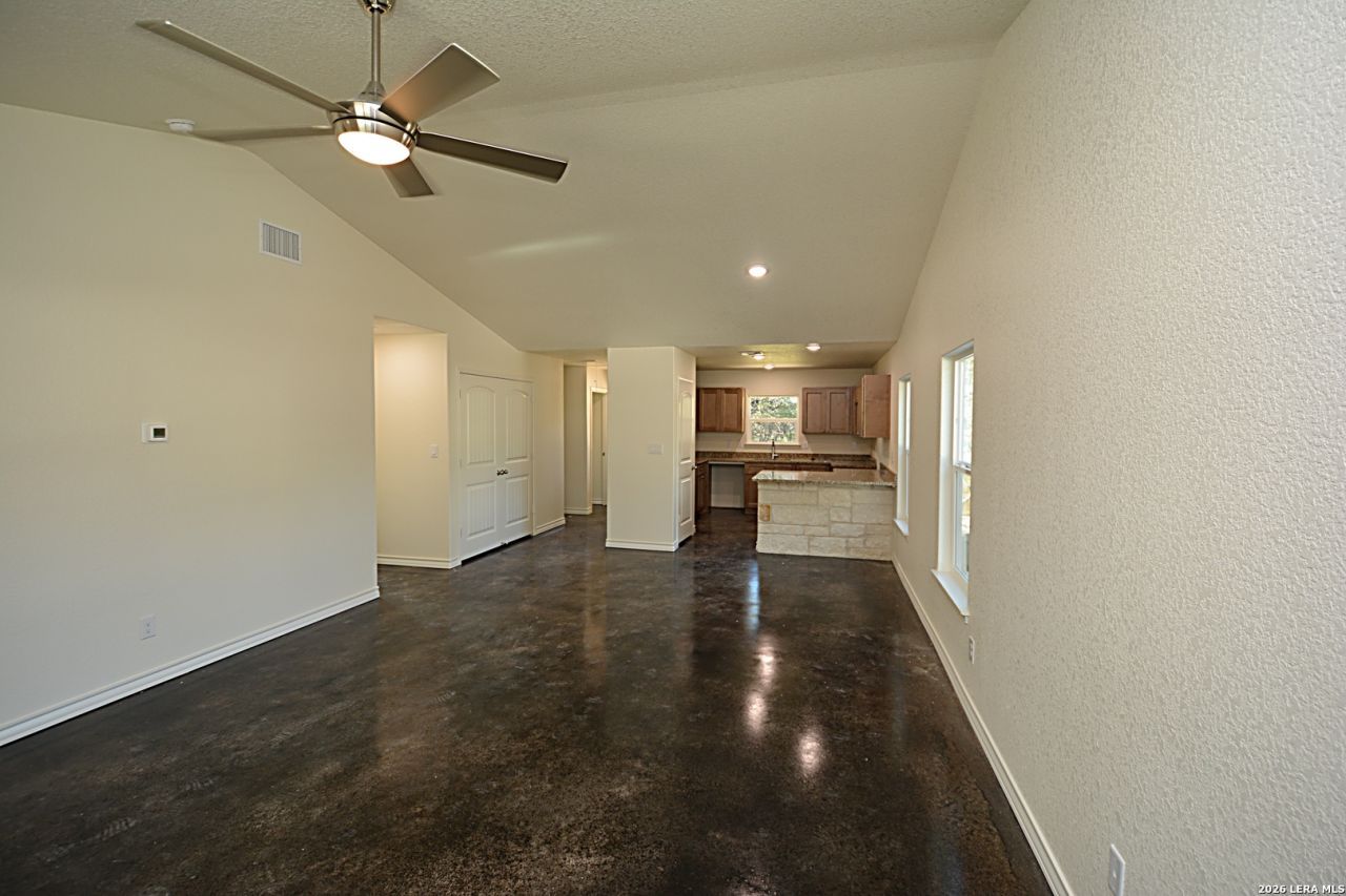 This open concept plan has soft close cabinets, granite counters and high ceiling with stained concrete floors throughout. Located near end of street with acreage tract behind it!