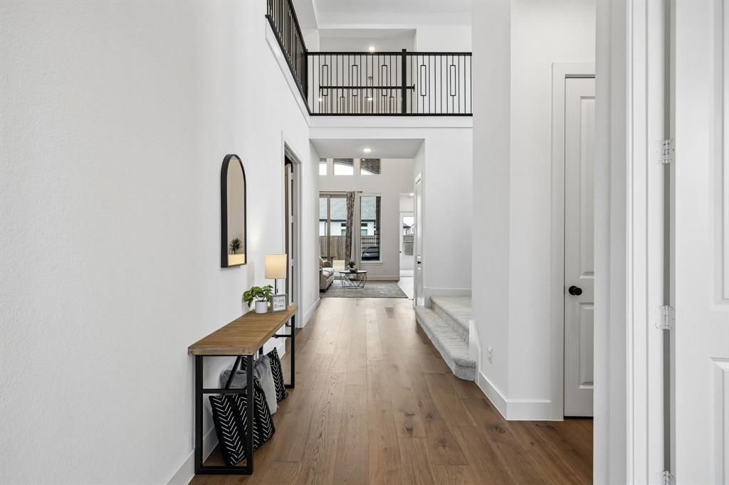 Stunning corner-lot Highland Home in coveted master-planned community of Sandbrock Ranch with 4,300+sq ft of thoughtfully designed living space with 5 beds, 5.5 baths, study, media room, & game room. Flexible floor plan features four beds with ensuite baths plus an option for two primary suites—one up & one down, making it ideal for multigenerational living. A grand double-door entry opens to soaring ceilings and a dramatic two-story living room anchored by a painted brick fireplace. The open-concept kitchen, living, and dining areas are connected by a custom dry bar wall with wine refrigerator and open shelving, creating the perfect entertaining space. The chef’s kitchen showcases quartz countertops, double ovens, a 6-burner gas cooktop, stainless vent hood, breakfast bar, designer lighting, and a bright eat-in dining area. The first floor includes two ensuite bedrooms, including a luxurious primary suite with sitting area, walk-in closet, spa bath with freestanding tub, walk-in shower, dual sinks plus vanity area & designer finishes. Upstairs offers three generously sized beds and a large game room. The private media room down adds even more entertainment flexibility. Additional highlights include engineered hardwood flooring in living areas, luxury lighting throughout, and high-efficiency designer ceiling fans. The oversized utility room features extended cabinetry and a built-in sink. Parking is plentiful with a split three-car garage with epoxy flooring—one side-entry two-car garage plus a separate single-car bay. The exterior highlights include an extended patio and jellyfish lighting. Located in an amenity-rich master-planned community offering an infinity-edge pool, fitness center, fire pit area, stocked fishing lake, miles of hike and bike trails, dog park, play areas, a three-story treehouse, carriage house, and year-round community events and classes. A rare combination of luxury, flexibility, and exceptional community living—this home truly has it all.