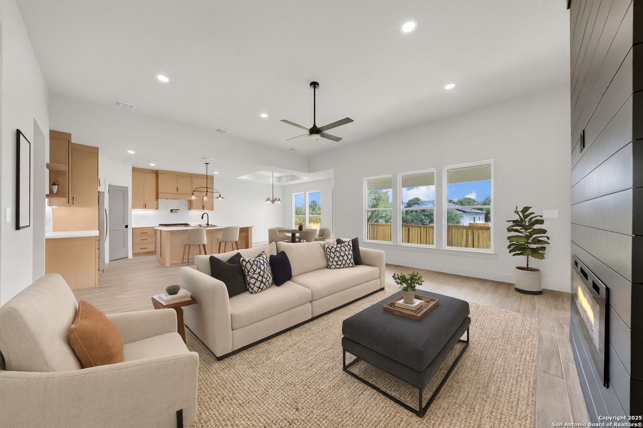 Builder Incentives Available! Incentive #1: Apply toward closing costs and/or a rate buydown. Incentive #2: Custom upgrades/modifications available (builder incentive may be applied toward approved upgrades). Welcome to 1556 Rimrock Cv, where modern comfort meets timeless Hill Country style. Thoughtfully designed with high-end finishes and a functional open layout, this stunning new construction home features soaring ceilings and expansive 6-foot windows that fill the interior with natural light. Porcelain tile flooring throughout offers both durability and refined elegance. The chefs kitchen is beautifully appointed with custom cabinetry, quartz countertops, under-cabinet lighting, premium fixtures including a Kohler kitchen faucet, and LG appliances. Bathrooms are equally elevated with Delta fixtures, a Kohler water closet, and sleek Kwikset hardware throughout. Additional upgrades include a cozy fireplace, A/C smart thermostat, and water softener prep for long-term ease and efficiency. Freshly completed landscaping enhances the clean curb appeal, making this home truly move-in ready. Located in the desirable Cypress Cove community, this home is just 1 mile from Boat Ramp 11, where the Guadalupe River flows into Canyon Lake - perfect for boating, fishing, kayaking, and weekend water activities. Community amenities include a park, swimming pool, BBQ area, basketball and tennis courts, and a reservable community center for special events. Centrally positioned with quick access to San Antonio, New Braunfels, Boerne, Austin, and the Canyon Lake Hill Country area, this home offers the ideal balance of peaceful living and convenience.