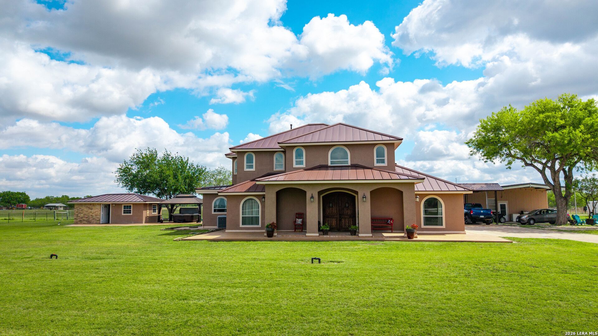 Experience the perfect blend of luxury living and wide-open Texas land with this exceptional 33.84+/- acre estate along the scenic San Antonio River. This remarkable property offers a stunning 4,297+/- sqft custom home, complemented by a 304+/- sqft casita with a bedroom and full bath, a 1700+/- sqft metal workshop featuring a one-bedroom, one-bath apartment, and an impressive 4,368+/- sqft metal barn. The custom home is truly the centerpiece, designed with both comfort and entertaining in mind. It features two spacious primary bedrooms with private ensuites, and a third bedroom. The open-concept layout seamlessly connects the large great room, dining area, and a gourmet island kitchen, creating a warm and inviting atmosphere filled with natural light. A den with a full bath, a dedicated laundry room, and an upstairs large multipurpose/game room complete with a wet bar and full bathroom provide flexibility for everyday living and entertaining. The downstairs primary suite offers two walk-in closets, a separate sitting area, and a full bath with a shower. Upstairs, the second primary suite includes a large walk-in closet, an expansive bathroom with dual vanities and a shower, and private access to a beautiful covered balcony overlooking the property. The gourmet kitchen is thoughtfully equipped with a six-burner gas cooktop, double built-in ovens, a wine refrigerator, built-in microwave, warming drawer, and a large island with a second sink and seating-ideal for both casual meals and hosting guests. Outdoor living is just as impressive, featuring a large covered patio and porch, a covered patio with a hot tub, and two carports. The surrounding acreage of native grasses & coastal is cross-fenced and offers endless possibilities, whether for cattle, horses, hunting, farming, or recreational use. The gently rolling land extends to the San Antonio River, providing both beauty and functionality. The lawn, 14+/- acre pasture and 2+/- acre horse trap are all irrigated. There are 2 wells (one with a new pump) and a 5000+ gallon cistern. The large barn has an 800 amp transformer, 240 and 120 amp plugs, a vehicle lift with a 240 amp compressor, water, LEDs and is plumbed for gas. There is an RV spot with septic, water and electric. This one-of-a-kind estate offers space, versatility, and serene natural surroundings-truly a must-see property.