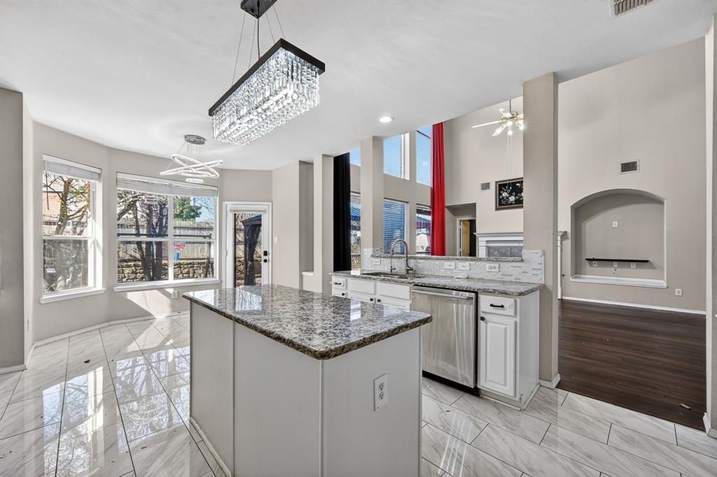 This two-story brick home features 5 bedrooms and 3 bathrooms with 3,196 square feet of living space on a 7,841 square foot lot. High ceilings and solar panels enhance comfort and efficiency. The kitchen includes wooden cabinetry, granite countertops, a center island, stainless steel appliances, and tile flooring. The living room offers wood floors, soaring ceilings, and a fireplace. The primary suite includes a double vanity, walk-in closet, soaking tub, and separate shower. A two-car garage, landscaped front yard, and spacious backyard provide great outdoor living and entertaining space.
