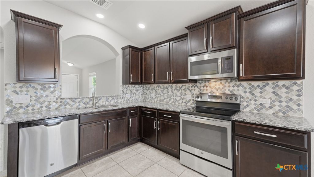 Comfort, convenience, and thoughtful upgrades! Ideally located just minutes from Clear Spring Elementary, this home offers an inviting layout with stylish finishes throughout with No Rear Neighbors!. Step inside to a spacious living room that flows seamlessly into a well-appointed kitchen featuring granite countertops, stainless steel GE appliances, glass tile backsplash, recessed lighting, and a cozy breakfast area framed by two large windows?bringing in plenty of natural light. The home offers 3 bedrooms and 2 full baths, including a generous primary suite with dual vanities, an oversized walk-in shower with dual showerheads, and a large walk-in closet. Enjoy easy living with ceramic tile throughout the main areas and carpet in the bedrooms only, plus a spacious laundry room with additional pantry storage for added functionality. Outside, youll find custom stone flower beds, a large covered front porch, and a covered back patio with upgraded tile and privacy shade screen that backs to a greenbelt?perfect for relaxing or entertaining. The backyard also includes a durable Lifetime shed for extra storage. Numerous updates throughout?see feature sheet for full list. Avery Park features a community pool and playground close by!