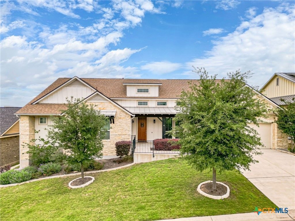 This home delivers true WOW factor from the moment you arrive. With striking curb appeal, its designed to impress?featuring a beautiful stone exterior, stylish metal roof accents, and an expansive front porch perfect for relaxing while overlooking the serene, oak-filled community park just across the street. Inside, the thoughtfully designed floor plan offers both elegance and functionality. A private study sits just off the entry, while the oversized living room provides the perfect space for entertaining. The spacious island kitchen shines with modern white cabinetry and flows seamlessly into a generously sized dining area?ideal for gatherings of any size. Freshly painted throughout, the home feels current, bright, and move-in ready, awaiting your personal touch. The oversized primary suite is a true retreat, offering space for a sitting area and complemented by a luxurious, spa-inspired bathroom. Enjoy an oversized oval soaking tub, dual vanities, and a beautifully appointed walk-in shower. Don't miss out on the pass through laundry room from the master suite - a modern luxury convenience! Step outside to the large covered back patio with floored patio and patio blinds, where vaulted ceilings and exposed beam accents create an inviting space to unwind or entertain?perfectly completing the homes grand design. Extras include the upgraded water filtration system, garage storage and close proximity to all of Kissing Tree's amenities - just a walk to fitness center, community restaurant or neighborhood events and activities. This exceptional property truly has it all?dont miss your chance to see it in person. Schedule your showing today.