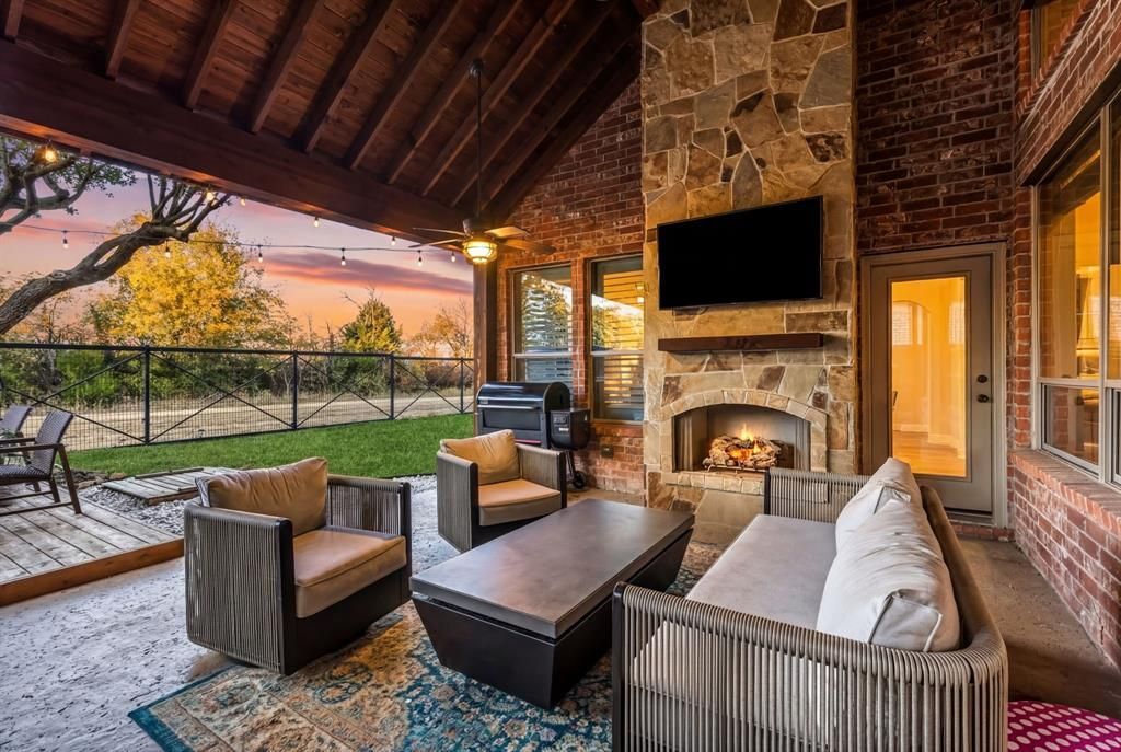 STUNNING 4-BEDROOM GREENBELT HOME IN PROSPER ISD! An incredible opportunity in Greenspoint—one of Prosper ISD’s most sought-after communities, zoned to the state-of-the-art Walnut Grove High School. This beautifully designed home features a light-filled open floor plan with soaring ceilings, rich hardwood floors, and four spacious bedrooms—three on the first floor and a private bedroom, full bath, and game room on the second level—ideal for guests and multigenerational living. The home also offers a 3-car garage, double ovens, generous storage, and thoughtful upgrades throughout.The tranquil primary suite is a true retreat, complete with new carpet, peaceful views of the backyard and a spa-like bath w two closets. A dramatic wall of windows in the living room and kitchen frames stunning greenbelt scenery, flooding the home with natural light and creating seamless indoor-outdoor living.Step outside to a one-of-a-kind outdoor living experience—reminiscent of a Hill Country escape—featuring an outdoor kitchen, fireplace, expansive covered patio, and oversized backyard backing directly to the greenbelt—perfect for entertaining and year-round enjoyment.Prime location near Town Lake, the brand-new Raymond Park, and just minutes from top-tier shopping, dining, and entertainment. Easy access to major corridors for commuting convenience. No MUD or PID taxes! This home delivers lifestyle, luxury, location, and long-term value in one exceptional package.