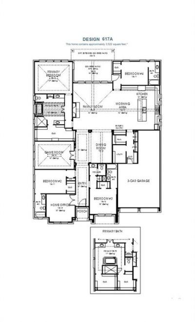 Home office with French doors set at entry. Formal dining room and game room with French doors frame extended entry. Family room with sliding glass doors and fireplace opens to morning area and kitchen. Kitchen hosts elongated island with built-in seating space. Primary suite includes bedroom with wall of windows. Dual vanities, freestanding tub, separate glass-enclosed shower and large walk-in closet in primary bath. All secondary bedrooms feature private baths. Soaring ceilings and large windows add to this generous four-bedroom design. Covered backyard patio. Mud room leads to three-car garage.