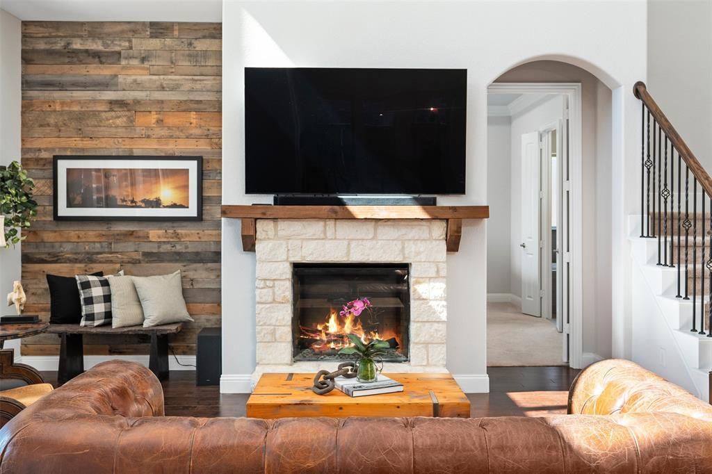 Soaring ceilings, natural light, and elevated finishes define this South Arlington home designed for both everyday living and effortless entertaining. The two-story living room features rich wood floors, a stone fireplace with wood mantle, and high windows that bring in morning light. The open-concept kitchen anchors the home with an oversized granite island, stainless steel appliances, oven, microwave, custom vent hood, and abundant cabinetry—ideal for hosting or daily meal prep. Modern lighting and clean-lined finishes give the space a fresh, move-in ready feel. The primary suite offers a spacious retreat with tray ceiling detail and room for a sitting area. The spa-style bath includes a soaking tub, oversized walk-in shower, and dual vanities for a comfortable start and end to the day. Additional ensuite on the first floor. Upstairs offers two more bedrooms and secondary spaces providing flexibility for a home office, game room, or workout area. The backyard extends your living outdoors with room to relax or entertain. Conveniently located with access to Hwy 287, 360, and I-20, and just minutes from shopping and dining near Cooper and Arlington Highlands.