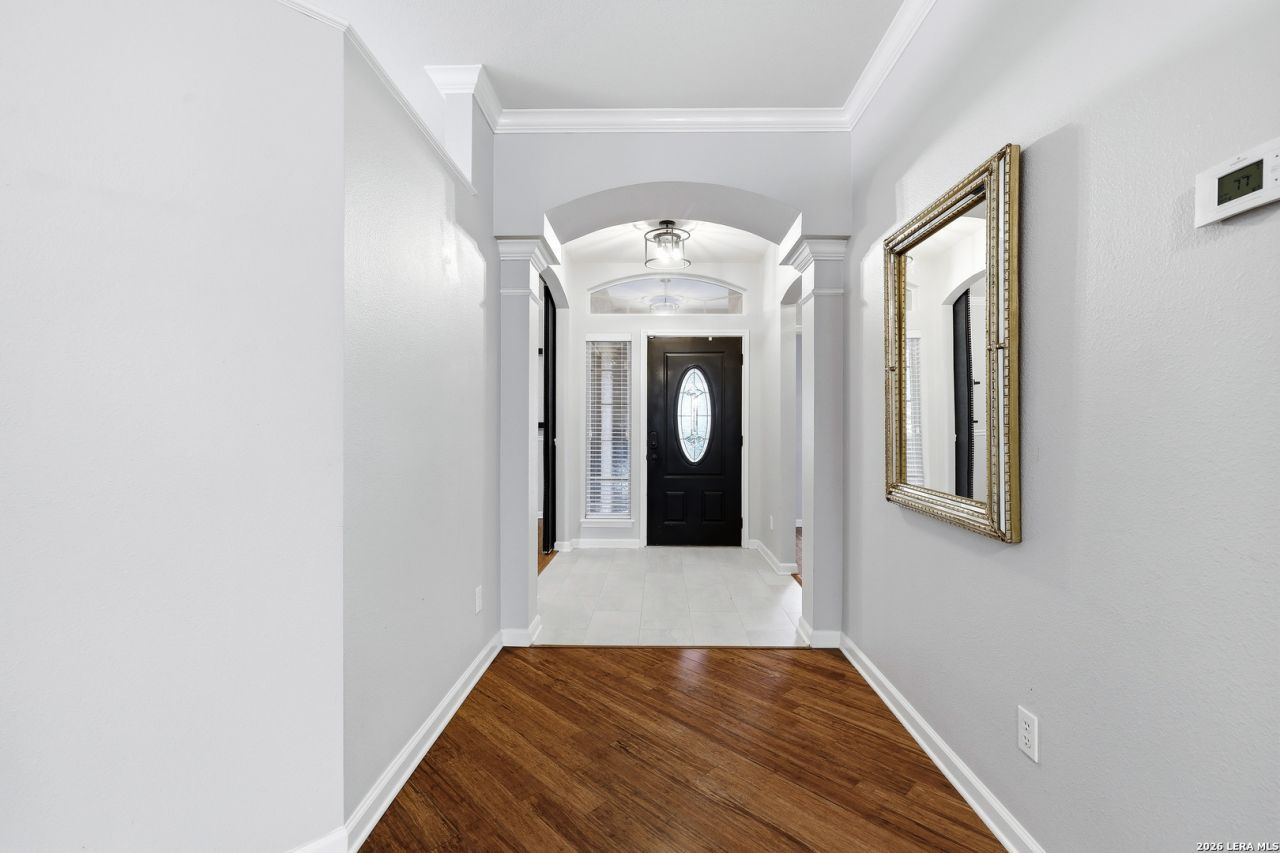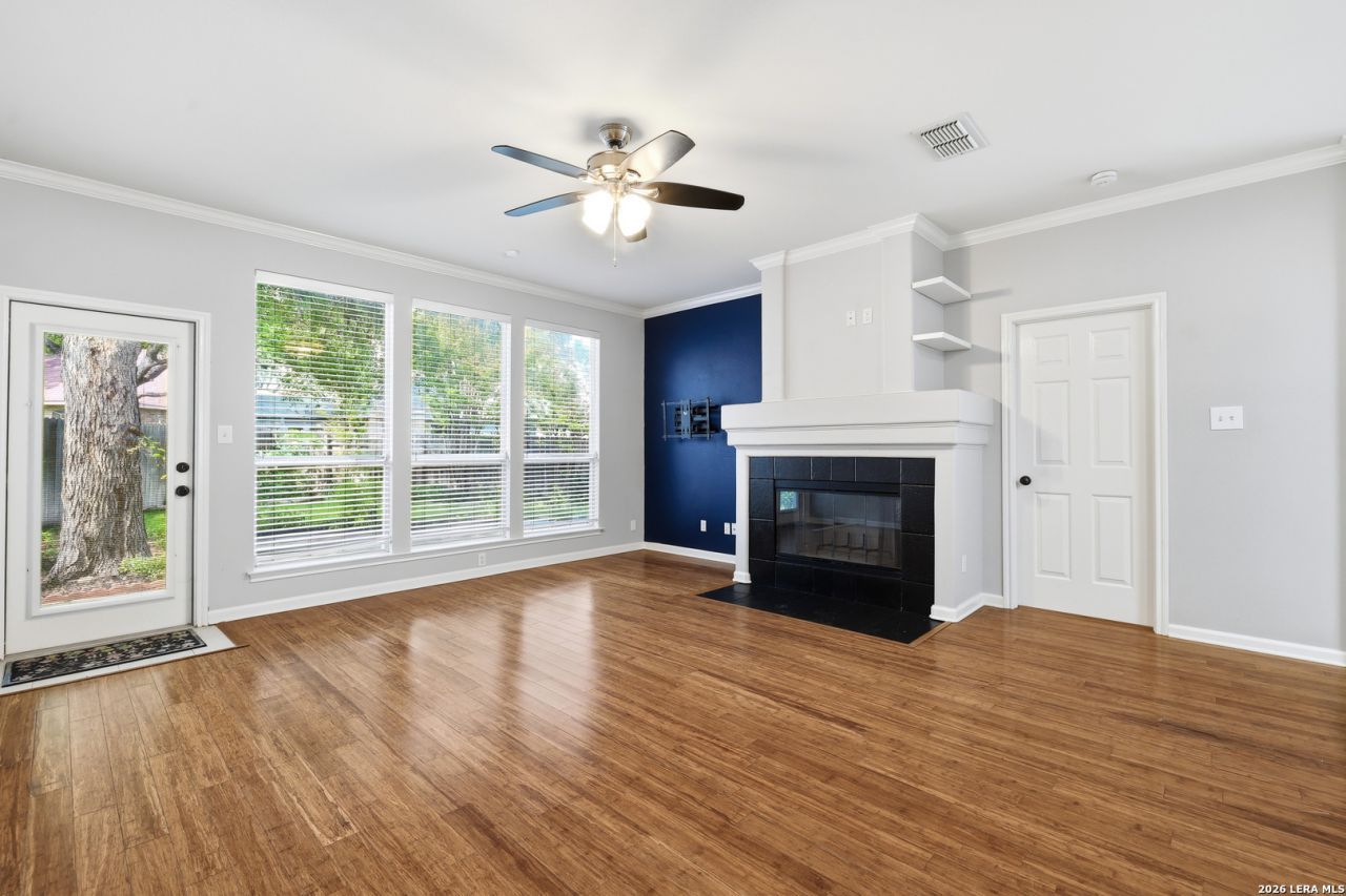 Welcome to this beautifully maintained 3-bedroom, 2-bath single-story home nestled in the highly sought-after gated community of Berry Creek. Thoughtfully designed for both comfort and style, this home offers a warm and inviting atmosphere from the moment you step inside the large entryway. The spacious family room serves as the heart of the home, featuring a cozy wood burning fireplace framed by modern stucco accents and a stylish accent wall-perfect for relaxing or entertaining. Elegant bamboo wood flooring, installed just four years ago, flows throughout the main living areas, while durable ceramic tile enhances all wet spaces. Additional upgrades include 2-inch wood blinds, updated crown molding, contemporary light fixtures, and refined finishes throughout. The private primary suite provides a peaceful retreat, complete with a generously sized ensuite bathroom featuring a seamless glass shower and a large walk-in closet. The homes functional layout also includes a convenient garage entry leading into an oversized pantry and laundry room with ample shelving for storage and organization. The kitchen blends practicality with style, offering stainless steel appliances, granite countertops, tile flooring, and a breakfast bar ideal for casual dining or hosting guests. Step outside to enjoy a spacious backyard designed for both relaxation and entertaining, featuring a large patio, mature trees. A full sprinkler system services both the front and back yards. The front yard features decorative stone. A 10x10 storage shed, with wood floor provides valuable additional space for hobbies or storage. Additional peace of mind comes with a roof inspection completed in 2023. Conveniently located just off FM 3009, this home offers an easy commute to Randolph Air Force Base and quick access to nearby shopping, dining, and entertainment. It is also served by the highly regarded Schertz-Cibolo-Universal City ISD. Enjoy being just a short drive from popular destinations such as New Braunfels, Gruene, Canyon Lake, the Guadalupe River, and Natural Bridge Caverns. Dont miss the opportunity to make this exceptional home yours!