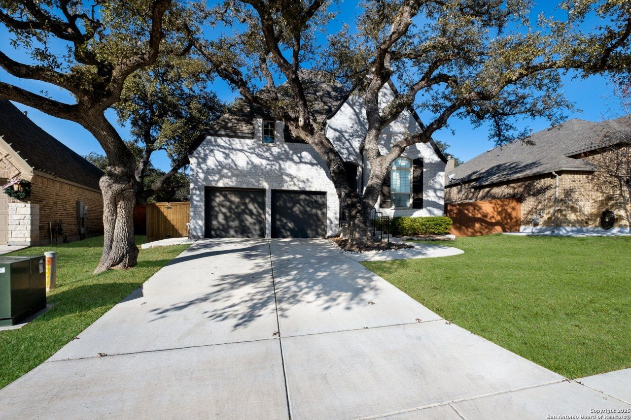 Step into modern elegance with this meticulously designed one of a kind property that perfectly blends functionality with style. With amazing curb appeal youll notice the custom brick color, large mature oaks, and upgrading landscaping. Featuring 3 bedrooms and 2.5 bathrooms with a media room/flex room and an office area this home boasts an open floor plan that includes a sleek and inviting kitchen featuring waterfall black granite countertops, high-end stainless steel appliances, crisp white custom Ken Moore cabinetry, and a spacious central island with seating-ideal for casual dining or entertaining guests. The dining area transitions seamlessly into a light-filled living space with soaring ceilings, large windows, and timeless hardwood floors that flow throughout the main areas, creating a warm and sophisticated ambiance. The primary suite is your personal retreat, featuring a spa-like en-suite bathroom with dual vanities, a luxurious walk-in shower, and ample counter space. There a plantation shutters throughout, 8 doors, custom baseboards, deco light switches, a custom built-in desk, and much more! A versatile layout makes this home perfect for both relaxation and gatherings. Whether youre hosting friends or enjoying a quiet evening in, the clean design and stylish finishes make every corner of this home shine. Outside, youll find plenty of space to create your ideal outdoor sanctuary with the composite 20x25 rear deck overlooking the greenbelt. Located in the highly sought-after Boerne community, this residence offers convenient access to the charm of local shops, dining, and schools while being a short drive from San Antonio amenities. Dont miss your chance to make this stunning property yours-schedule your private showing today!
