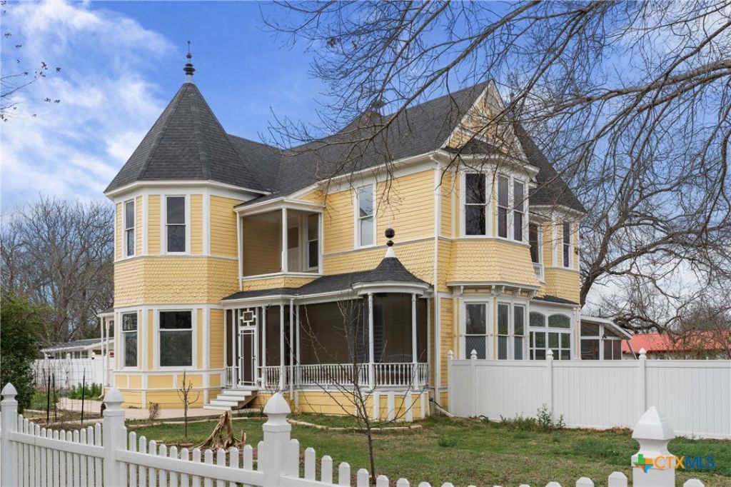 The Kuykendall Queen Anne Victorian ? One of Central Texass Most Beloved Landmarks Circa 1898?1900 | 3,250 sq ft | 3?4 bed | 2 bath | 0.4925 ac | Welcome to a living piece of Texas history thats been brought completely into 2026 without losing a single ounce of its soul. From the street, people slow their cars just to admire the classic turret, wrap-around porches, gardens and perfect white picket fence. Inside and out, every detail has been obsessively restored and upgraded ? new roof (2025-garage), new paint (2024), adjustable steel-pier foundation (2020), spray-foam insulation in walls and under first floor flooring, tankless water heater, Starlink internet hardware and pre-wired, and a restored private water well in addition or as backup to city water. This is not just a gorgeous Victorian. It is one of the most complete, turn-key urban homesteads you will ever find on under half an acre in the heart of town. Interior Highlights: Original long-leaf pine floors, three restored fireplace mantels. Grand dining room with Italian La Nordica wood-burning cookstove. Chefs kitchen: gas range, dual sinks, wine fridge, Samsung fridge. First-floor in-law / Airbnb suite with private entrance, restored cast-iron sink, walk-in tiled shower. Palatial upstairs master with Queen Anne curved window seat, hidden gun safe, cedar closet, and direct porch access. Spa master bath: clawfoot tub inside the huge walk-in shower, marble vanities, back-lit stained-glass laundry chute. Former 4th bedroom now a luxurious walk-in closet with island and twin crystal chandeliers (easily converted back). Black EMF-blocked meditation / future closet room Outdoor Living Most Homes Only Dream Of. Six porches total ? screened, open, heated/cooled, tiled, with stained-glass accents and pet-proof screening. Brand-new screened sunroom / outdoor dining room with bead-board ceiling, ceiling fan, and panoramic garden views. Massive detached two-car garage + office nook and RV/boat parking.