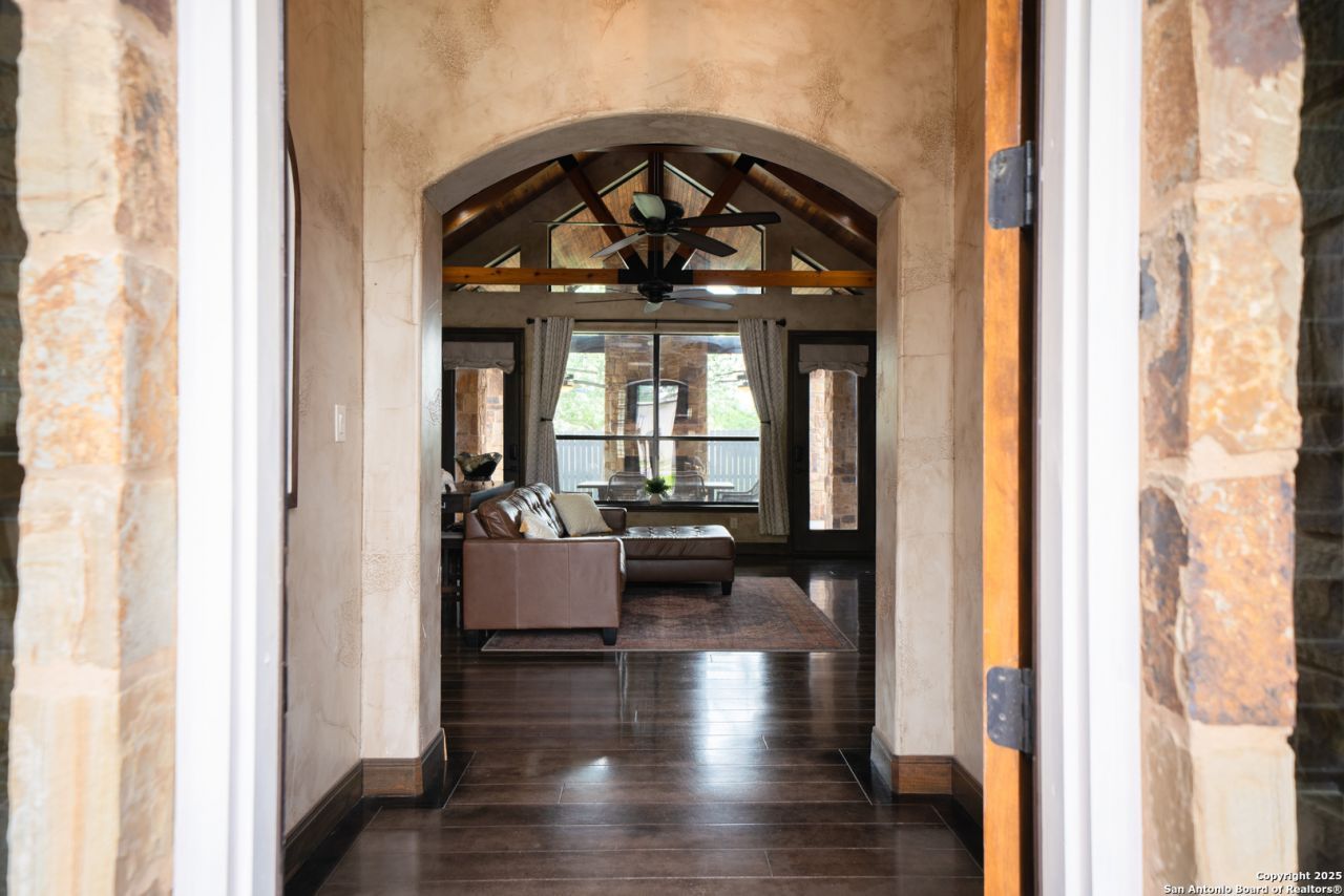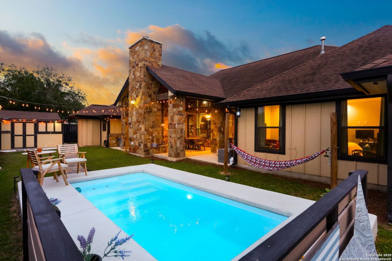 Experience the perfect blend of character, comfort, and luxury in this beautifully designed residence, ideally situated on a spacious corner lot in the heart of Poth, TX. Offering 4 bedrooms, 4 full bathrooms, and split primary suites, this home is thoughtfully laid out to provide flexibility and privacy. Step inside to find an open-concept layout that flows effortlessly through the living, kitchen, and dining spaces. The dedicated formal dining space offers a sophisticated setting for gatherings. Stamped concrete flooring flows throughout, enhanced by original wood detailing from the original home on the property in the living and dining spaces adds warmth and historic charm to the home. A dedicated office/study offers the perfect space for remote work or quiet reading. The heart of the home extends outdoors to a generous covered patio, complete with four ceiling fans, a cozy outdoor fireplace, and a refreshing plunge pool-perfect for year-round relaxation and gatherings. Additional highlights include a side-entry 2-car garage, enhancing curb appeal and functionality. Located in a convenient and sought-after area of Poth, this home combines the serenity of small-town living with modern luxury features and thoughtful design. Dont miss the opportunity to own this rare and refined property-schedule your showing today!