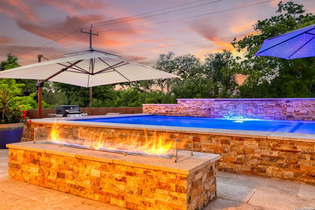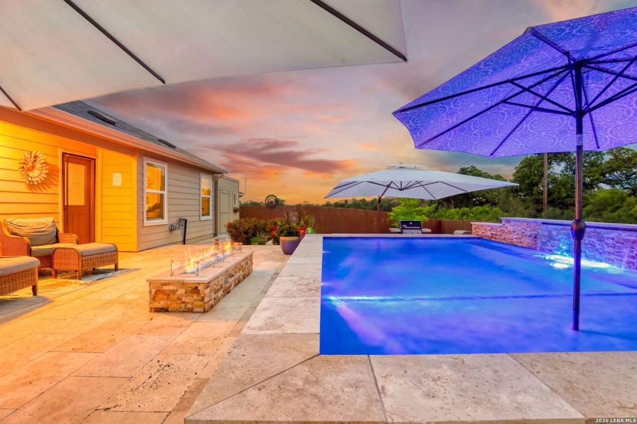 Welcome to your private backyard oasis in the heart of Bulverde. This beautifully maintained 3-bedroom, 2-bath home with a dedicated office offers the perfect blend of comfort, style, and outdoor living. Step inside to an open, light-filled layout featuring wood-look flooring, high ceilings, and a seamless flow between the living, dining, and kitchen areas ideal for both everyday living and entertaining. The office provides a perfect work-from-home setup or flex space to fit your lifestyle. The spacious primary suite offers a relaxing escape, while secondary bedrooms are well-sized and thoughtfully positioned. The homes curb appeal, clean landscaping, and inviting front porch add to its charm. ENJOY A VIEW OF THE TEXAS HILL COUNTRY!! The real showstopper is the backyard. Designed for relaxation and entertaining, youll enjoy a stunning custom pool with water features, ambient lighting, and a built-in fire feature that creates an incredible evening atmosphere. Enjoy neighborhood Amenities include an infinity pool with clubhouse, gym, BBQ area, basketball court, walking/jogging trails, park/playground, and even a stocked fishing pond!! Easy Access to Bulverde, Spring Branch, New Braunfels and San Antonio Too!
