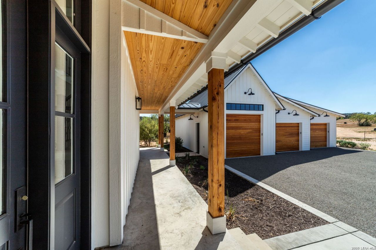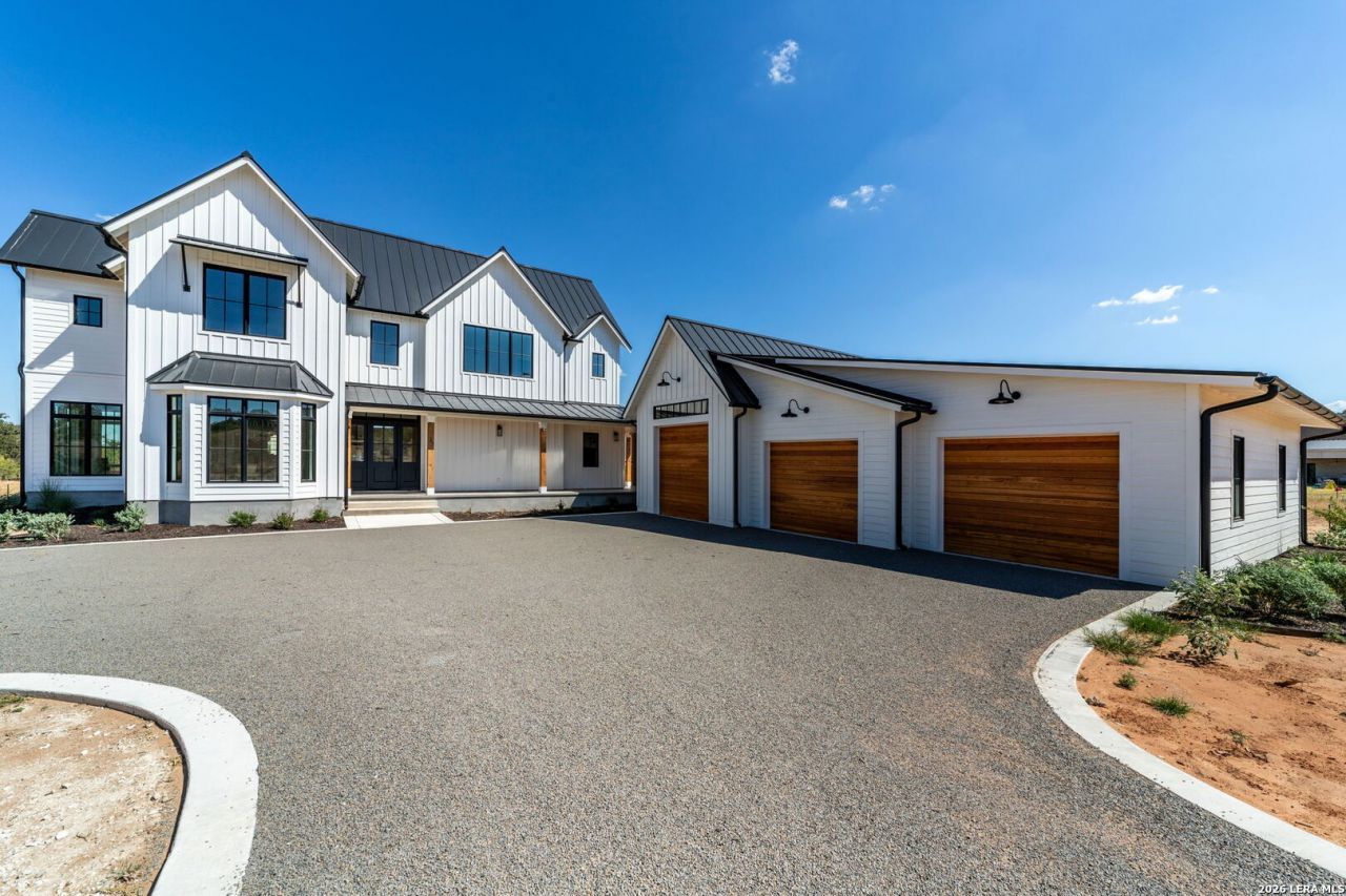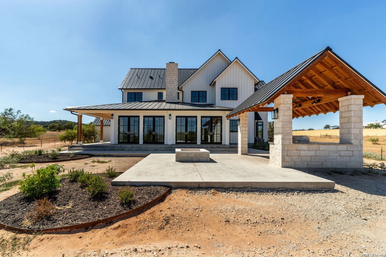 Located less than a mile from Fredericksburg, this custom modern farmhouse on 5.75 acres features a 40 GPM well, climate-controlled sunroom, outdoor kitchen, and high-end finishes throughout. Completed in 2023 by Tandem Building Corp, this thoughtfully designed home offers quality craftsmanship, privacy, and convenience. The property features a 40 GPM water well and maintains an AG exemption, helping keep property taxes low. The home is designed with all bedrooms located on the second floor, including the primary suite, two guest bedrooms, and the laundry room. The main level is dedicated to living and entertaining, featuring a spacious living room, kitchen, formal dining room, and sunroom. The custom kitchen is beautifully appointed with high-end stainless steel appliances, including a large built-in refrigerator and wine fridge combination, along with ample cabinetry and workspace. Just off the kitchen, the living room offers a warm and inviting atmosphere with a cozy fireplace and French doors on both sides, opening into a brick-paved, climate-controlled sunroom that overlooks the back patio and outdoor kitchen-creating a seamless indoor-outdoor living experience. The main floor also includes a breakfast area, a formal dining room highlighted by an elegant glass chandelier, a convenient half bath for guests, and a versatile utility room with a large sink and cabinetry-ideal for a pet wash area or additional storage. Upstairs, each bedroom features its own private en-suite bathroom. The primary suite is exceptionally spacious, showcasing a 14-foot custom ceiling, a large walk-in closet, and high-end finishes throughout. Glass chandeliers placed throughout the home add to its refined, custom feel. Outdoor living is just as impressive, with a wraparound patio leading to a custom outdoor kitchen and firepit area-perfect for entertaining or relaxing under the Texas sky. The expansive acreage also provides an ideal setting for a future pool. The three-bay garage is oversized to accommodate up to six vehicles, includes a mini-split system for climate control, and offers additional space suitable for RV storage. Opportunities like this are rare-a high-end custom home on over 5 acres, less than a mile from Fredericksburg.