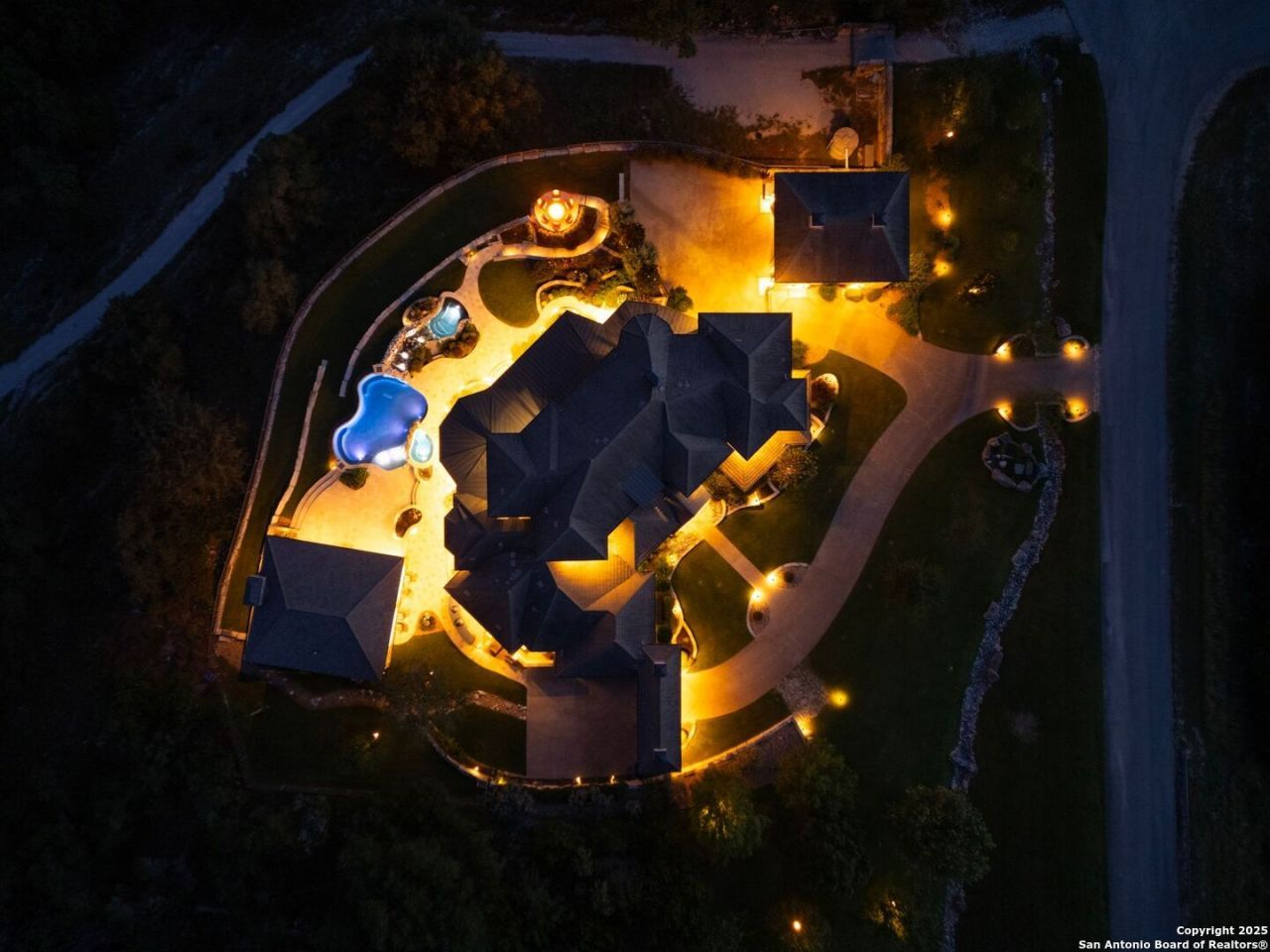 Welcome to 325 River Ridge, a stunning custom-built luxury home by G. Morris Homes, set on just under 9 acres in the heart of the Texas Hill Country. This one-of-a-kind property offers panoramic views of the Guadalupe River and surrounding hills - the perfect setting for quiet, luxury, Hill Country living. Located in the prestigious Mystic Shores community, this home combines privacy, elegance, and convenience, with easy access to San Antonio, Austin, New Braunfels, and Houston - making it ideal for both a full-time residence or a Hill Country getaway. Step inside and experience breathtaking views from nearly every room. The thoughtfully designed floor plan offers privacy for each bedroom, multiple entertainment areas, and open-concept living spaces perfect for gatherings. Entertain in style and pour a glass from your 400-bottle climate-controlled wine room and enjoy the unforgettable river views from your dining area. Outdoor living at its finest with a covered patio featuring electric shades, a luxury pavilion with heated floors, fireplace, air conditioning, and an infinity-edge pool with waterfall, hot tub, and peaceful water views. Car enthusiasts will love the 8-car garage capacity, and technology lovers will appreciate smart home features including interior and exterior security cameras easily monitored from your phone or iPad. Built with ADA accessibility in mind, this home includes ramps, an elevator, wide hallways, and accessible showers, ensuring comfort for every stage of life. The 980 square foot guest house provides a full kitchen, living room, dining area, laundry, bath, and bedroom - perfect for visitors or in-home care. Energy efficiency and comfort were top priorities in construction, with insulation in every wall, ceiling, and between floors, Aprilaire systems in both homes, a four-step water filtration system with reverse osmosis and UV treatment, cistern-fed irrigation, and a commercial-size Kohler whole-house generator for total peace of mind. Enjoy the natural beauty of Mystic Shores, where youll often spot deer and native birds thanks to the nearby community nature preserve. Take a walk down or drive down the private switchback trail to your serene meadow, surrounded by trees and Hill Country tranquility - a true slice of heaven. Come experience the view that words cant capture - because at 325 River Ridge, the views are worth the visit.