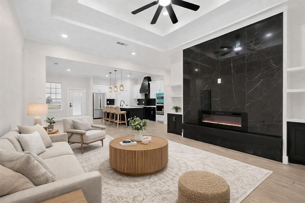 Stunning 3-bedroom, 2.5 bath modern farmhouse new construction. Featuring board-and-batten siding with stone accents and a welcoming covered entry, this home blends timeless curb appeal with contemporary luxury. Close to Cedar Creek Lake with easy access to nearby marinas and boat ramps, enjoy lake life just minutes away. Inside, enjoy a bright open-concept layout with designer finishes throughout, including two-tone cabinetry, quartz countertops, a bold black subway tile backsplash, matte black fixtures, and built-in stainless appliances. The spacious living area is anchored by a breathtaking floor-to-ceiling fireplace feature wall, creating the perfect statement centerpiece for entertaining or relaxing. The private primary suite includes a large walk-in closet and spa-inspired bath with dual vanities and modern finishes. Two additional bedrooms provide flexibility for guests, family, or a home office. Complete with a 2-car garage and modern craftsmanship throughout this home is the perfect blend of farmhouse charm and upscale design.