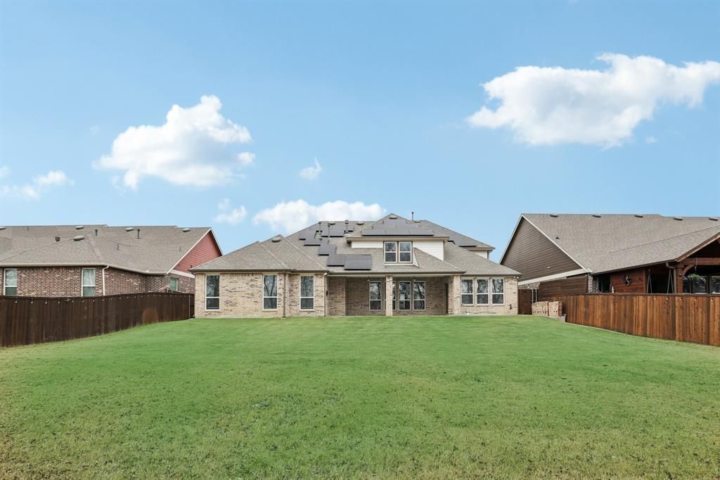Welcome to 4109 Stableglen, a stunning two-story home in the desirable Somerset Park community, enhanced with a wide array of modern upgrades and smart-home features. Exceptional curb appeal greets you with a stone and brick exterior, inviting front porch, permanent trim lights across the front, and thoughtfully maintained landscaping. Inside, the grand entryway sets the tone with elegant stair railing and an open, welcoming atmosphere. Just off the foyer, is a front office with French doors that provides a versatile space for work or quiet focus. The open floorplan seamlessly connects the living area, dining space, and expansive kitchen—perfect for everyday living or effortless entertaining. The kitchen offers abundant counter space, a center island, and generous cabinetry, while the living area is enhanced by a cozy electric fireplace. . The large primary suite provides a relaxing retreat with an accent wall and a private bathroom featuring a garden tub, double vanities, and ample storage. With five bedrooms and four bathrooms, the layout includes exceptional space for family or guests, plus an impressive upstairs flex room. The home has many premium upgrades, including 32 solar panels, permanent surge protection installed on the breaker box, a full sprinkler system, and an electric vehicle plug in the garage. The three-car garage is finished with a durable epoxy-coated floor, and the backyard features a large covered patio, full fencing, and a tuff shed for additional storage. This home is equipped with video doorbell, smart light switches, smart thermostats, smart garage door controls, and a full security system, offering convenience, efficiency, and peace of mind. Designed with comfort, technology, style, and practicality in mind, 4109 Stableglen is a truly remarkable home offering exceptional value and modern living in the heart of Somerset Park.