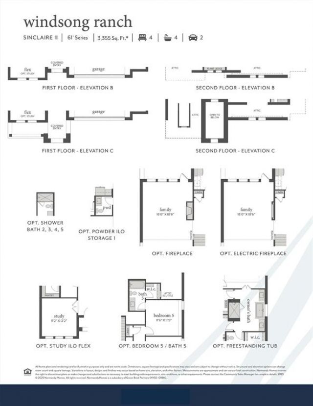 NORMANDY HOMES SINCLAIRE II floor plan. This beautiful 5-bedroom, 5.5-bathroom home is designed to impress with soaring open-to-above ceilings and a cozy electric fireplace in the family room that creates a warm and inviting centerpiece. The main level features the luxurious owner’s suite along, with his and her closets, no more arguing over closet space! Also, on the first floor is secondary bedroom and full bath, providing comfort and flexibility for guests or multi-generational living. A private study offers the ideal space for work. Upstairs you’ll find 3 more bedrooms and 3 full baths, two of which are on suite. The spacious game room and a dedicated media room are set up for endless entertainment. Throughout the home, custom finishes and stylish details elevate every space, blending modern elegance with everyday functionality. This is a home where comfort, sophistication, and convenience come together beautifully.