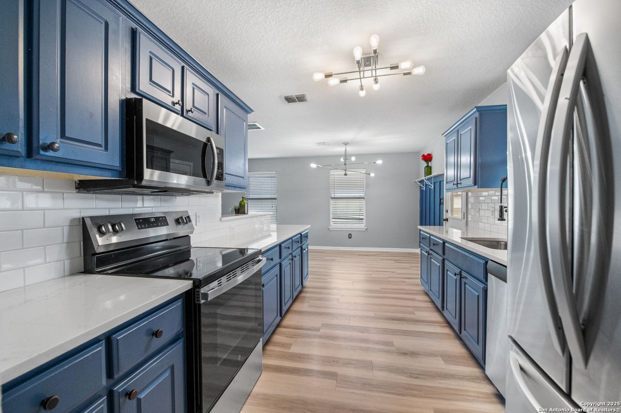 *Now offering $10k in flex cash to use toward cosmetics in the home, point buy down, etc!* A charming home near the neighborhood park and close to Potranca Creek, this home is nestled in a quiet neighborhood with schools and access to Hwy90/Loop1604 in proximity(3 minutes to access road). Neighborhood park features a gazebo, public restrooms, basketball court, walking trails, playground, and dog park. Less than 15 minute drive to Lackland AFB! This home boasts many upgrades and features. Garage is EV level 2 ready, kitchen has new beautiful quartz counter tops, new stove, dishwasher, and microwave over cooktop. LG Fridge included is 18 months old! Water heater is less than two years old. AC is about 2 years old and is energy efficient, yielding low energy bills during those hot summer months. Ceiling fans throughout the home. The home hosts plenty of storage space including a generously sized pantry in the kitchen. No carpet in the home. Bedrooms feature walk in closets. The backyard is not to go unnoticed! A spacious covered deck perfect for entertaining, includes the wall-mounted TV shown and includes a lawn mower to maintain this space. The end of the property backs up to a green area with mature trees. Property is more than inviting- come make this home yours today!