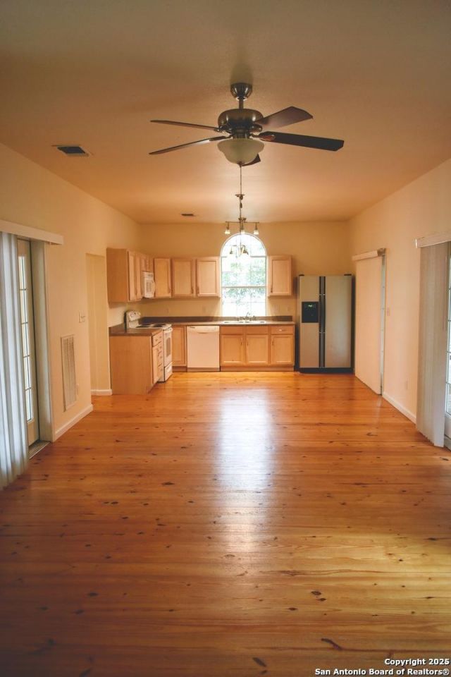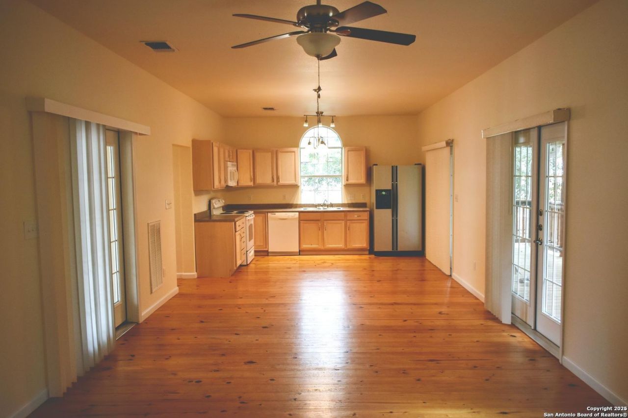 Very cute 2-2 home in Bandera within walking distance of everything. Wood floors throughout, metal roof, plus a nice and quiet covered back porch. Currently being rented and 24 hours notice needed. Low maintenance yard. Great Air BnB location! Large open living room, dining and kitchen area.
