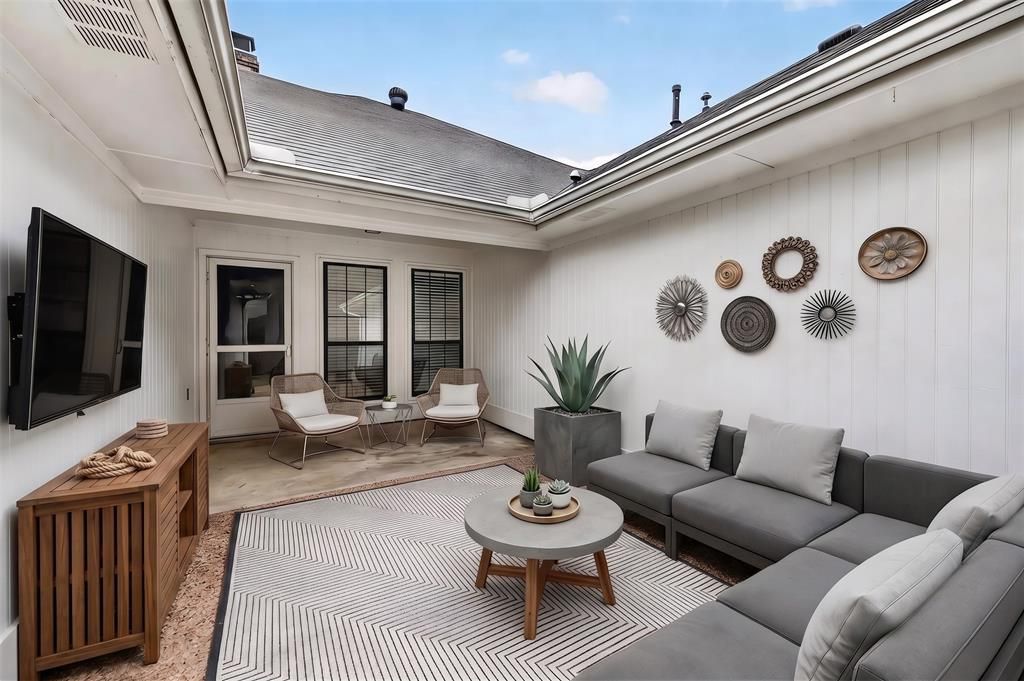 Nestled on a sprawling corner lot shaded by a canopy of mature trees, this Highland Village gem offers an inviting lifestyle of comfort and sophistication. As you step inside, extensive luxury vinyl plank flooring leads you into a warm living space anchored by a soaring floor-to-ceiling brick fireplace and elegant crown molding. The heart of the home is an updated kitchen designed for the home chef, featuring sleek granite countertops, a double oven, a central island, and a built-in planning center for seamless organization. Host memorable gatherings in the formal dining room, which boasts a striking barrel ceiling, or enjoy casual mornings in the breakfast area that opens directly to a private, sun-drenched courtyard. This thoughtful floor plan includes a spacious game room perfect for media or play, while the split bedroom layout ensures maximum privacy for all. Retreat to the secluded primary suite featuring a tray ceiling and a spa-like ensuite bath complete with a soaking tub, separate vanities with a makeup area, a skylight for natural radiance, wainscoting, and a walk-in closet with built-ins. Relax outdoors in your private backyard offering a covered patio and an extended open patio perfect for weekend BBQs. Practicality meets peace of mind with a recently replaced furnace, a two-car garage equipped with a workbench, and extra driveway parking. Refrigerator, washer, and dryer convey. Located just moments from the premier shopping and dining at The Shops at Highland Village and offering easy access to 35E, this home perfectly captures the essence of Texas living. Take a first-person look at this gorgeous home! Click the Virtual Tour link to see the 3D Tour!