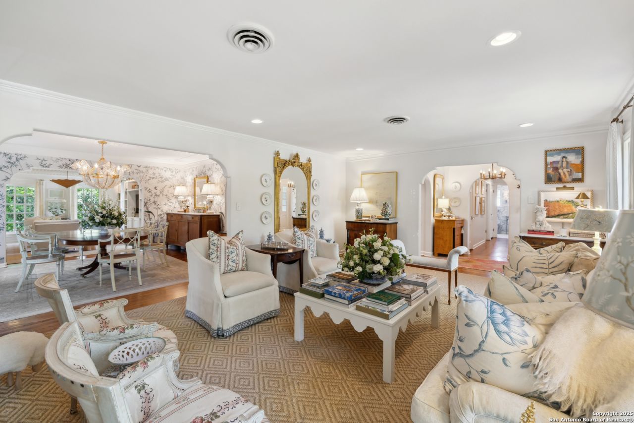 Featured in an expansive 10-page spread in Southern Living Magazine, this stunning residence is gracefully situated on a beautifully wooded lot in the prestigious enclave of Terrell Hills. The main home offers a harmonious blend of elegance and comfort, boasting three spacious living areas, three bedrooms, and two and a half bathrooms. Adding to its appeal is a fully detached, self-contained guest house (520 sq. ft.), complete with a well-appointed kitchen, full bath, inviting living area, and a private bedroom featuring a walk-in closet. Located within the highly sought-after Alamo Heights Independent School District (AHISD), this exceptional property presents a rare opportunity to own a truly distinguished home.