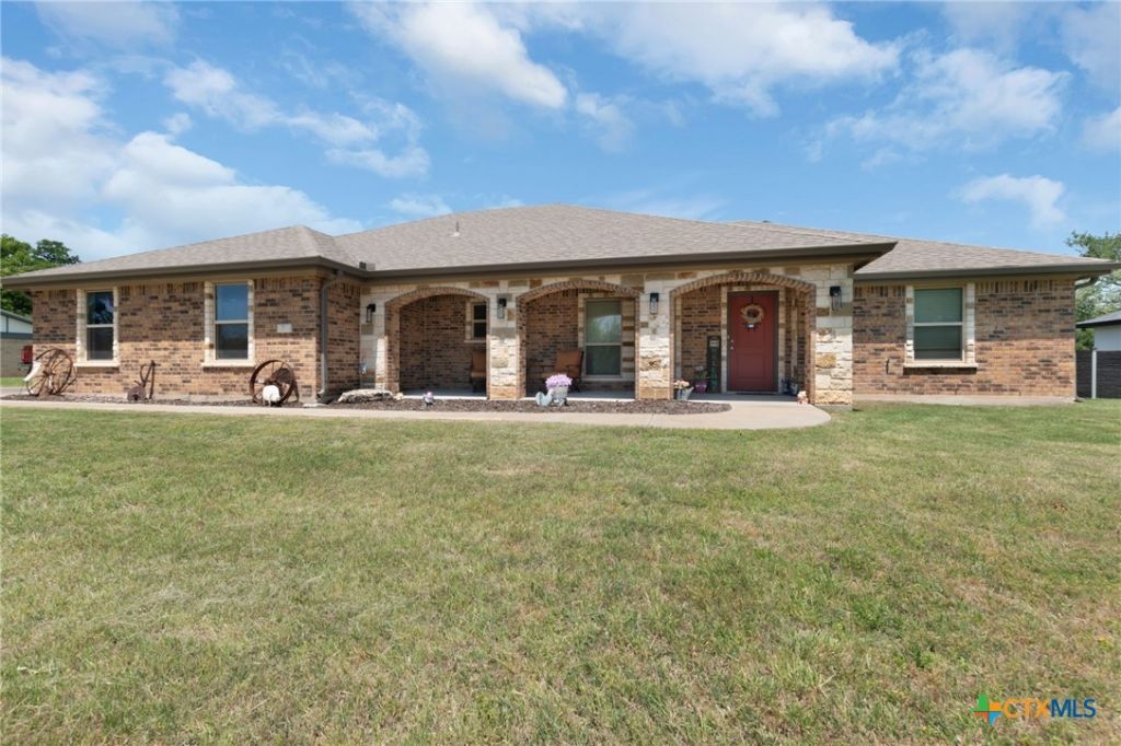 Built in 2020 by Atkinson-Wilson Homes, this well-crafted home in Lampasas sits on a spacious half-acre lot. The brick exterior with rock accents and composition roof offers timeless curb appeal, while the fully fenced backyard includes two storage buildings for added functionality. A 2-car garage completes the exterior. Inside, the 2,071 sq ft layout features 3 bedrooms and 2 bathrooms with an open-concept living, dining, and kitchen area plus a breakfast room. The living room features a cozy fireplace, and tile flooring runs throughout the main areas, with carpet in the bedrooms. The kitchen includes granite countertops and flows seamlessly into the main living space. The primary suite offers dual sinks, a soaking tub, separate walk-in shower, and a walk-in closet. The secondary bath includes a tub with tile surround. A utility room with sink adds convenience to this move-in ready home.