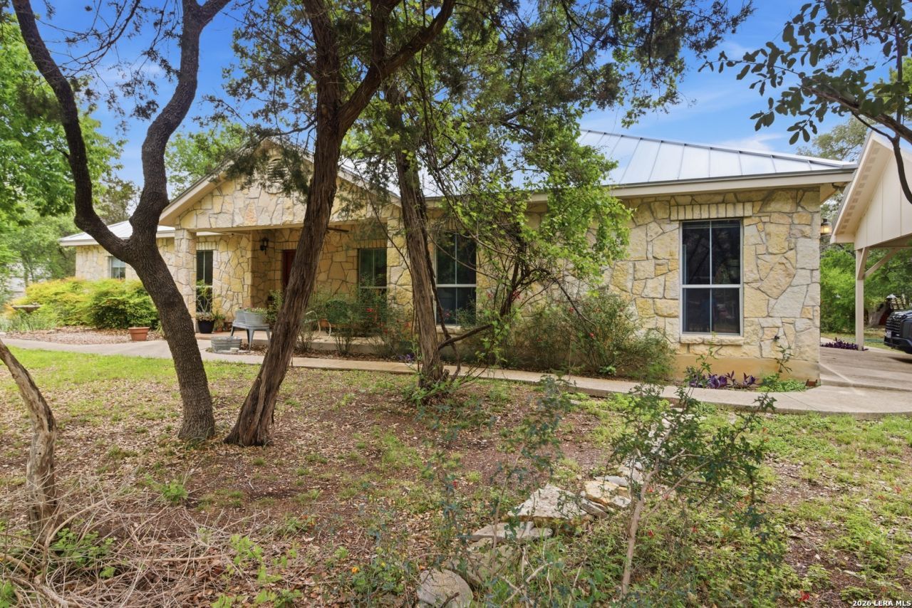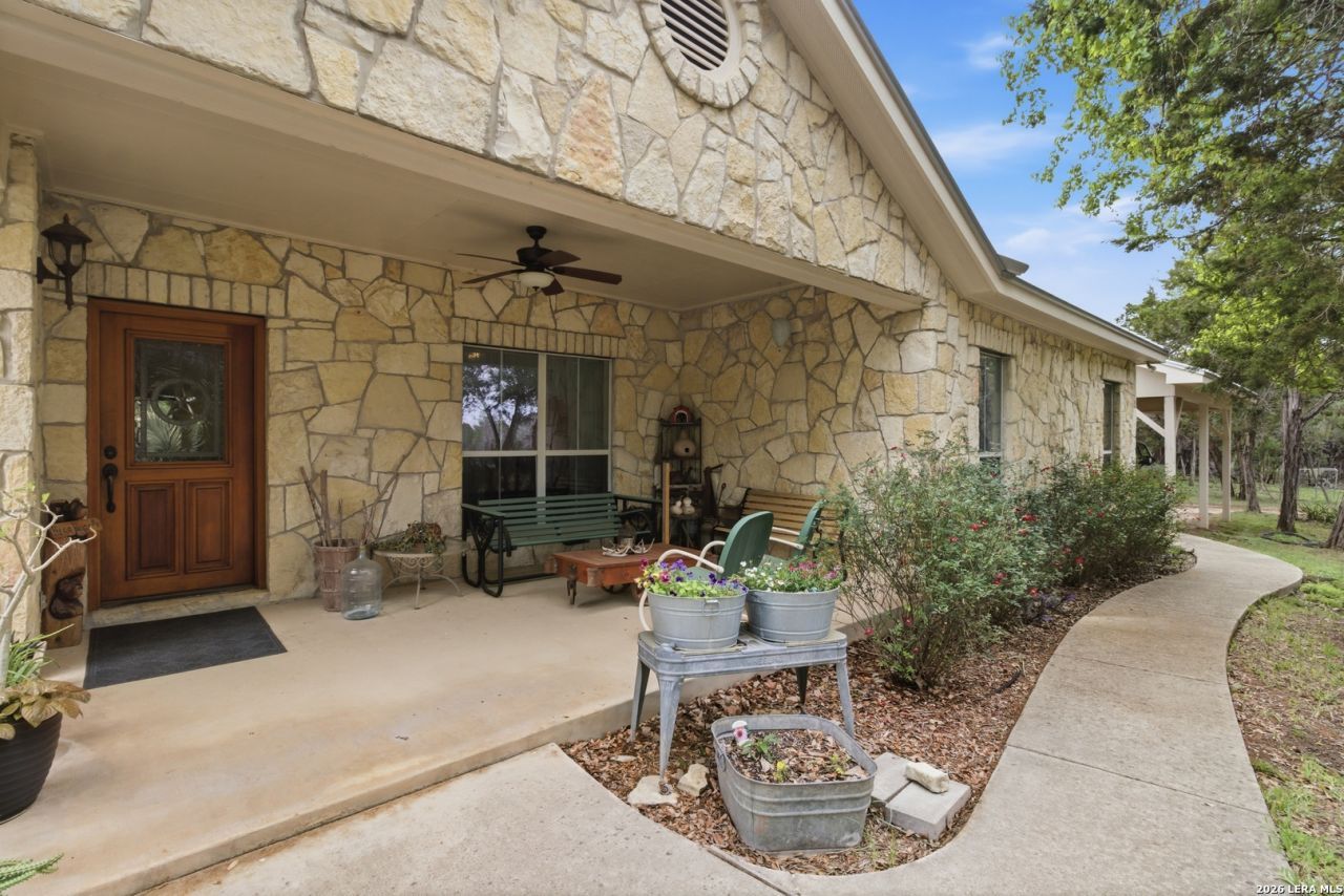 Tucked away in the scenic Texas Hill Country of Pipe Creek, this private and secluded 10-acre property offers the perfect blend of quality craftsmanship, country living, and homesteading functionality. Built with durability and efficiency in mind, this stunning 2,344 sq. ft. limestone home features 4 bedrooms, 2.5 baths, an office, and a large finished 2-car garage, all beneath a timeless standing seam metal roof. Inside, the home showcases soaring vaulted ceilings, rich wood flooring, ceramic tile throughout, and an impressive Hill Country stone wood-burning fireplace that anchors the living space. The thoughtfully designed floorplan includes both a formal dining room and an eat-in dining area alongside a chefs kitchen complete with granite countertops, custom wood cabinetry, walk-in pantry, and abundant storage throughout. Spacious walk-in closets and additional bonus closets provide exceptional organization options. The private primary suite offers a spa-inspired bath with double vanities, a walk-in glass shower, and an additional bonus office or den perfectly positioned to take in peaceful views of the beautifully landscaped grounds. The secondary bath features double vanities and a relaxing Jacuzzi jetted tub. Step outside and experience a true Texas Hill Country heritage property and homesteaders dream. The electric gated entrance opens to a game-proof cross-fenced area surrounding the home, driveway, and gardens. Outdoor living is exceptional with covered front and back patios, a limestone patio, and a gazebo-covered entertaining area ideal for relaxing evenings under the stars. Outside you will find Fig trees, Peach, Pomegranate, Redbud, Loquat, Burr Oak, Cedar Elms, Bigtooth Maple, Madrone, Mountain Laurel, Monterrey Oak, Buckeye Tree, desert willow, Possumhaw, Anaqua, Crepe Mytles, Cenizo, Chaste Tree, Toothache tree, Shantung Maple, native vines and plants, grapes and more(see attached list in mls). The property is fully equipped for gardening, livestock, and self-sufficient living with a whole house 24kw Generac generator and propane tank, water well & 3500 gallon water storage tank, multiple flower and vegetable gardens featuring 50-foot rows, a greenhouse with water and electricity, an older chicken coop converted into a garden tool shed, and a newer chicken coop with live chickens already in place. Additional improvements include a detached one-car garage for extra storage, a converted pull-behind trailer for permanent storage, and a substantial 1,152 sq. ft. animal barn complete with water, electricity, 220 service, and overhead hay storage. Currently under agricultural exemption with bees on the property, the land is well suited for livestock and ranch use with several fenced pastures and a separate utility entrance providing easy access to the barn and grazing areas. Energy-efficient construction features include urethane foam insulation in the walls and radiant barrier protection in the attic, helping maint