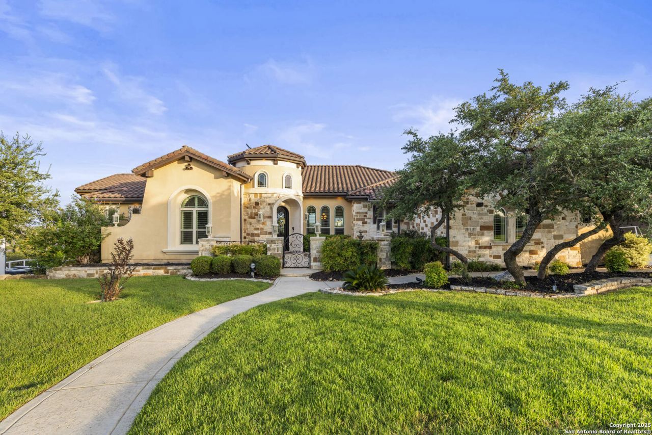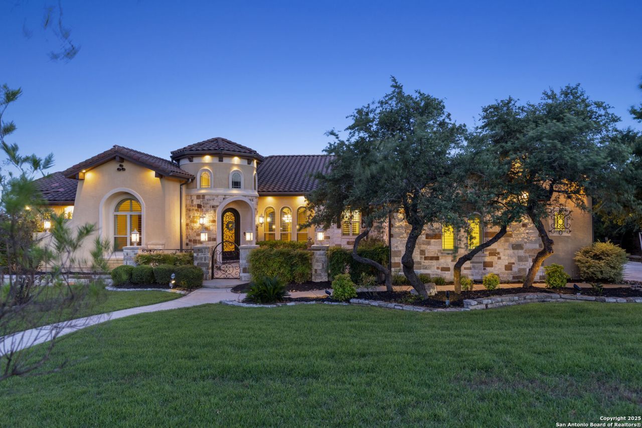 *** Motivated Sellers! *** Welcome home to Terra Mont! This stunning home features four bedrooms, three full baths, and two half baths - including two primary suites on the entry level, a rare and highly functional layout ideal for multi-generational living or long-term guests. Additional spaces include two living areas, a dedicated media room with projector, a private study with hidden passage, and an additional home gym or flex space. Located in the gated hilltop community of Terra Mont, this custom-built Solace Creek home sits on 1.18 private, south-facing acres backing to a shared natural canyon, perfect for privacy with minimal upkeep . The property offers unobstructed Hill Country views even stretching to downtown San Antonio, along with over +/- 2,000 square feet of decking designed to take full advantage of the picturesque setting. The island kitchen is equipped with a 6-burner Wolf gas cooktop with griddle, warming drawer, paneled refrigerator and dishwasher, walk-in pantry, and custom granite countertops. The breakfast room features a beautiful dome ceiling, and the formal dining room is connected to the expansive living room creating an open, welcoming space to accommodate larger gatherings with ease. Expansive windows frame the canyon views and bring in natural light throughout the heart of the home. The main primary suite offers patio access, a sitting area, dual tailored-height vanities with hammered copper sinks, dual walk-in closets, a whirlpool tub, walk-through shower with bench, separate toilet rooms, and direct access to the gym. The second entry-level primary suite includes a spacious bedroom, en-suite bath, large closet, and private kitchenette. Additional features include a whole-house intercom system, dimmable uplighting and downlighting, a whole-house generator, solar panels, and a water softener. This luxury, Mediterranean style home combines a flexible floor plan, custom craftsmanship, and elevated canyon views within one of Terra Monts most private settings. Additional interior finishes include Venetian plaster accents, a rotunda entry, custom iron gates and lighting, Travertine and wood flooring, and two gas fireplaces. Beyond that, an outdoor kitchen, mounted outdoor TV, and covered patio create functional outdoor living space with incredible sunrise and sunset exposure. Dont miss this rare opportunity to own a thoughtfully designed residence that offers, panoramic views, privacy, functionality, and elevated Hill Country living at its finest!