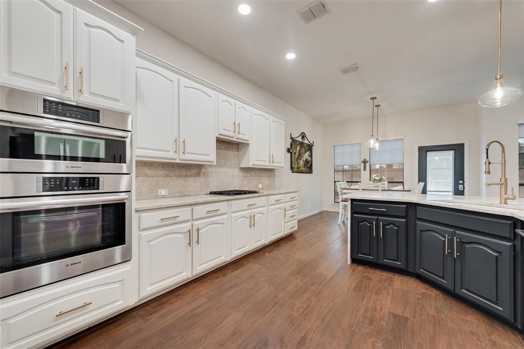 This stunning east-facing home offers 5 bedrooms, a 3-car garage with room for a large truck, and thoughtful updates throughout. The kitchen is a true standout, featuring leathered Taj Mahal countertops, a designer backsplash, Bosch appliances, white cabinetry with gold hardware, and an Iron Ore-painted peninsula that adds striking contrast. Wood-look tile flooring flows seamlessly across the first floor, enhancing both style and durability.The living room is warm and inviting, complete with soft neutral tones and a beautiful gas fireplace. The primary suite is a private retreat with a custom electric fireplace feature wall, mounted TV space, and blackout shades for added comfort. The fully remodeled ensuite bath includes a separate soaking tub, oversized walk-in shower with an 8-foot glass enclosure, and a custom vanity with soft-close cabinetry. The primary closet offers custom built-ins and a chandelier for an elevated touch.A wrought iron front door welcomes you into the formal dining room. Just off the entry, a flexible space can serve as a bedroom or office, with access to a half bath that has the potential to be converted into a full bath, plus a walk-in closet.Upstairs features spacious secondary bedrooms with a Jack-and-Jill bath, a large game room with added LED lighting and a ceiling fan, as well as an additional bedroom, full bath, and versatile bonus space.Additional upgrades include matching window shades, a Nest thermostat, motion sensor lighting in all garages and the laundry room, a tankless water heater, and a Class 3 impact-resistant roof installed in 2024—offering potential savings on homeowner’s insurance.Designed for both comfort and functionality, this home delivers upgraded finishes and flexible living spaces perfect for modern living.