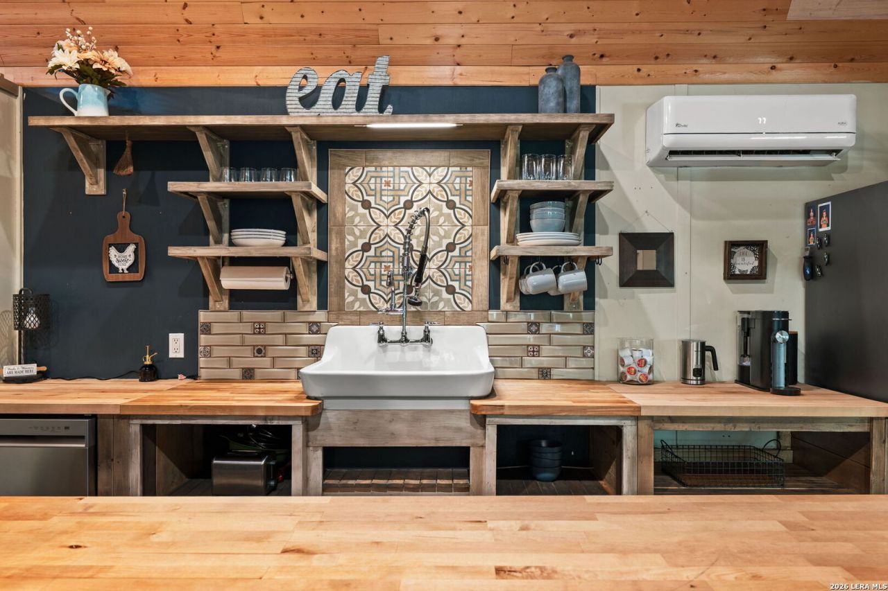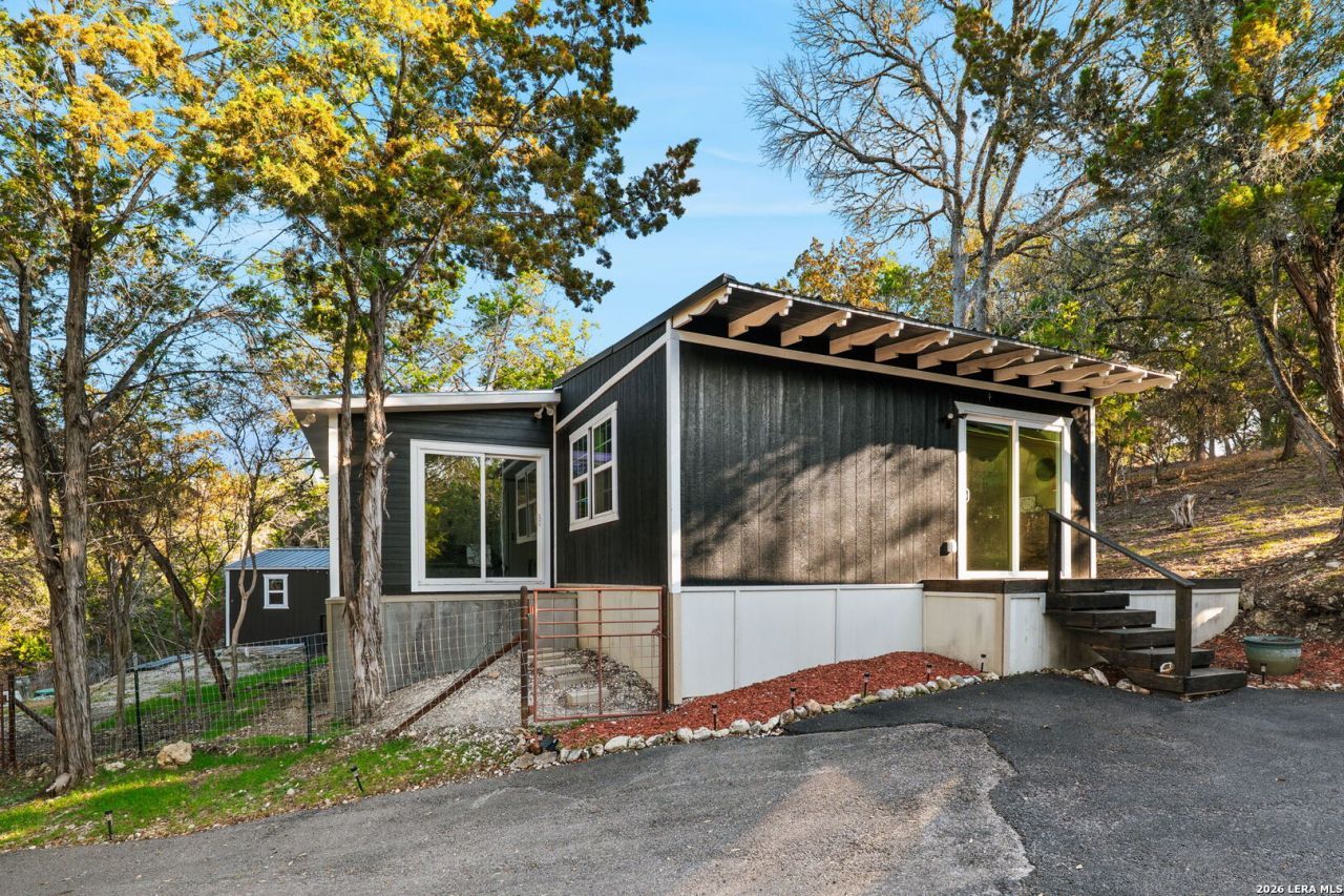 Situated on two lots totaling 0.69 acres and backing to a greenbelt, this Hill Country property with two residences offers rare privacy-only one neighboring house in front and none behind. Perched on a hill, the setting is peaceful and surrounded by sweeping natural views. The main home - with 2 bedrooms and 2 bathrooms, features elegantly rustic character, highlighted by wood ceilings and warm architectural details. The kitchen includes stainless steel appliances, a butcher block island, and breakfast bar, blending function with open design. A split-level upper space offers flexibility for a home office, studio, or additional living area. A detached second residence provides excellent income potential or private guest accommodations. Outdoor features include a two-car carport tall enough for an RV or boat, $8K in dog-friendly metal fencing, a new gravel pad with drainage culvert, storage shed, and a spacious back deck with a $15K hot tub that conveys. Additional highlights include three mini-split systems, multiple outdoor living areas, and a setting that truly captures Hill Country living. Conveniently located near Rebecca Creek Golf Course and just minutes from Boat Ramp 11 on the Guadalupe River and Canyon Lake, offering easy access to golf, water, and outdoor recreation. There has been added square footage from Comal CAD for master bedroom/additional living space.