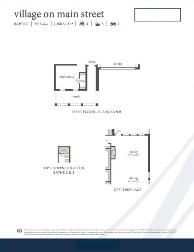 NORMANDY HOMES BAPTISE floor plan. Situated on a south facing lot, this charming front porch welcomes you inside a spacious one-story home with four bedrooms, three bathrooms and a study. All bedrooms offer generously sized walk-in closets. The well-designed open concept main living area seamlessly flows from one room to the next and makes entertaining a breeze. Tucked away, the owner's suite is private and relaxing with a spa-like ensuite featuring two vanities, an oversized shower and soaking tub. The owners closet on this home is to die for!